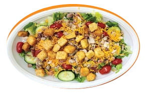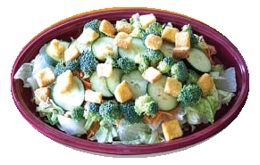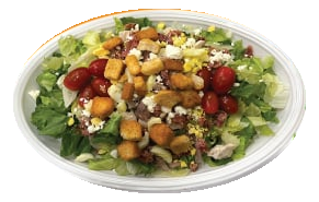 Q: What do you get when you take carrots, cucumbers, eggs, bleu cheese, bacon crumbles, and croutons on a bed of iceberg lettuce?